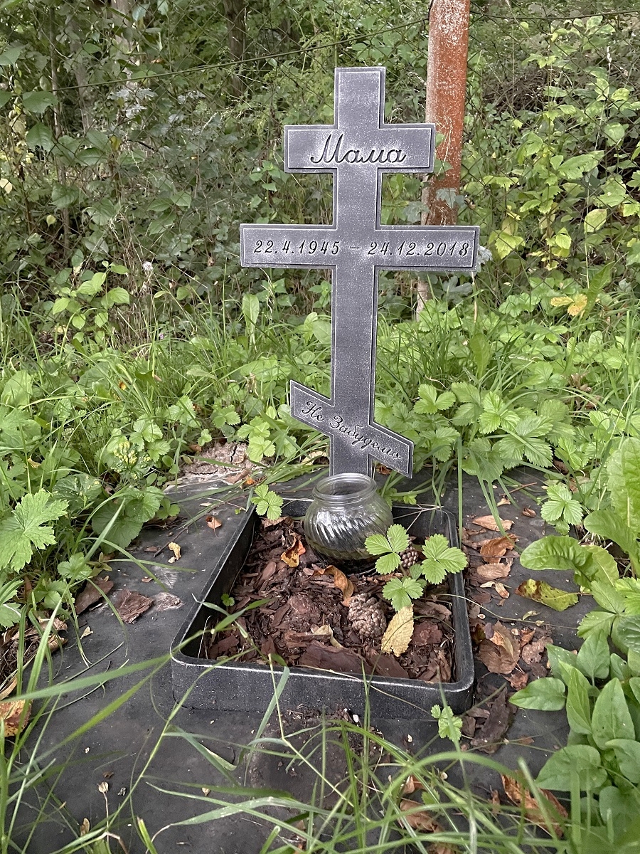 Grabstein mit einem geschmiedeten Kreuz, einem Foto und Inschriften