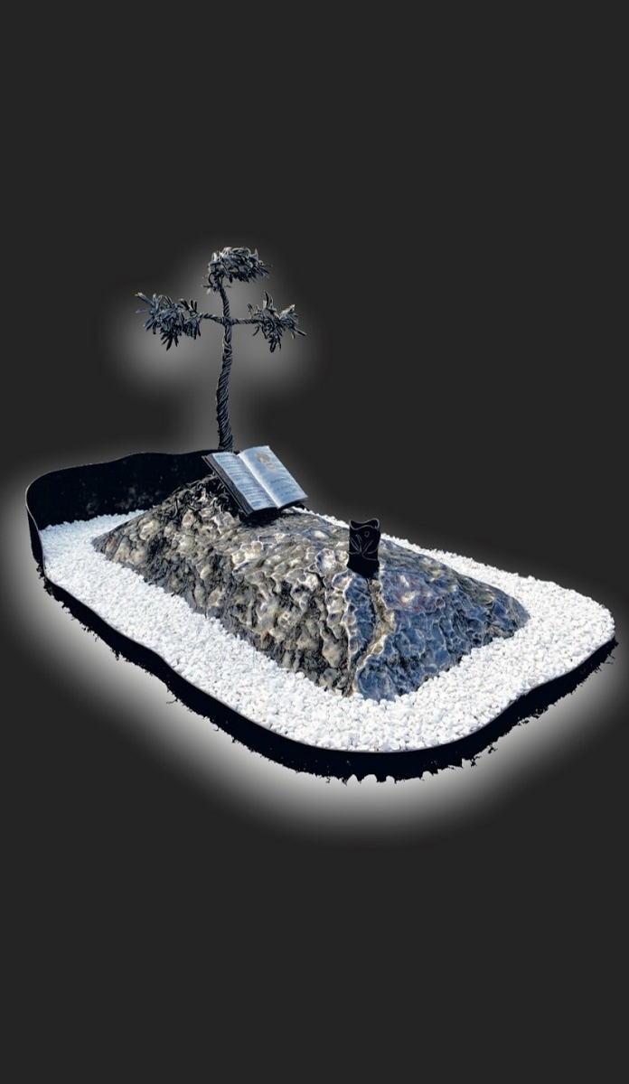 Ein Kreuz in Form eines Olivenbaums, auf einem Felsen platziert, mit einem offenen Buch, das über den Verstorbenen schreibt
