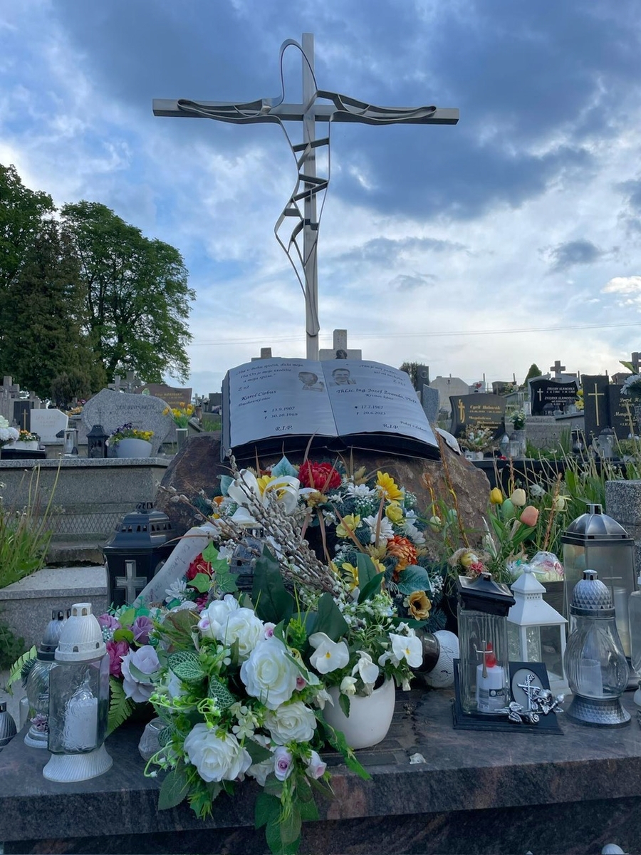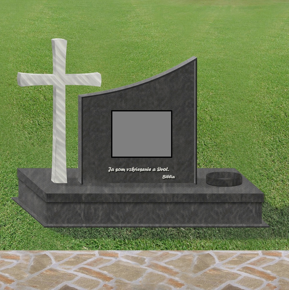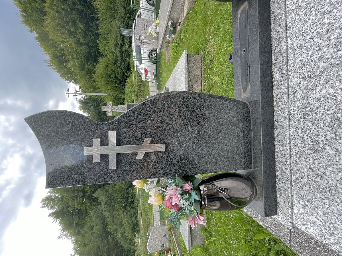 Monument – Grabstein mit einem geschmiedeten Kreuz, Inschriften und Foto